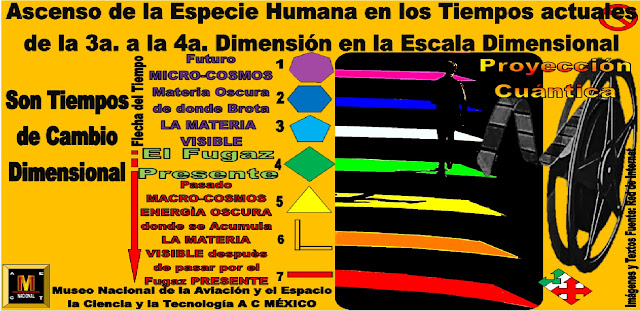 Presentamos esta ilustración formulada por nosotros, que por sí misma se explica y que esta indicando como vamos viajando del Microcosmos o MATERIA OSCURA que es el origen donde nace el FUTURO Y QUE ESTÁ EN EL ESPECTRO DE LA LUZ SOLAR DEL ULTRAVIOLETA Y NOS LLEGA AL MOMENTO FUGAZ DEL PRESENTE ubicado entre el color verde y el amarillo del ESPECTRO DE LA LUZ SOLAR para inmediatamente pasar al MACROCOSMOS que es la ENERGÌA OSCURA y que CÒSMICAMENTE CONOCEMOS COMO EL PASADO en la refgiòn del INFRAROJO del ESPECTRO DE LA LUZ SOLAR.